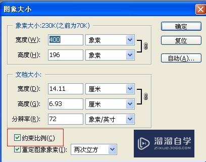 在“图像大小”对话框,如果想保持图片原有的长宽比例,选择“约束比例”,如果你想改变图像特定的长宽比的话,你可以取消“约束比例”。