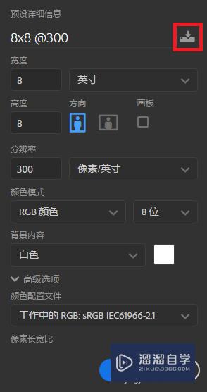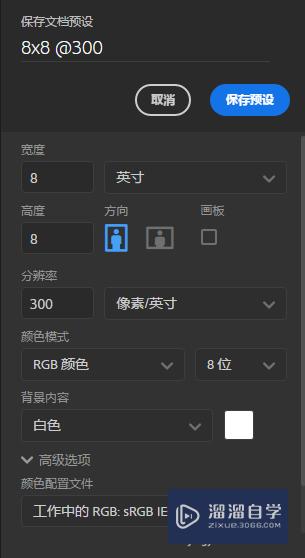 第四步,我们输入预设格式之后(如 高和宽是8英寸,分辨率为300的格式),我们命名之后,点击名称旁边图标。