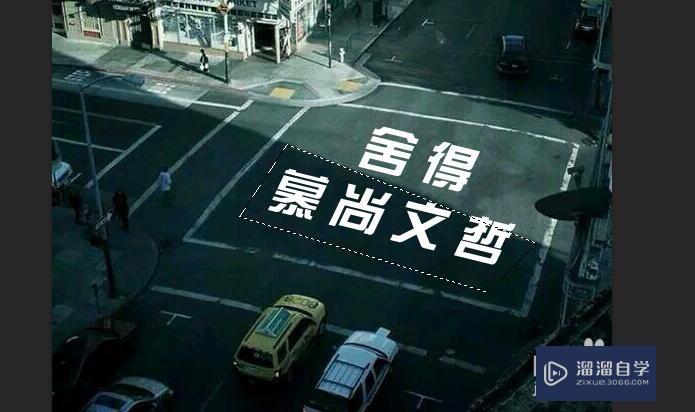 利用快捷键 ctrl+t 对字进行自由变换,先旋转使其一边与路平行,然后按住ctrl,拖动四个角调整字,使其四边都和路平行