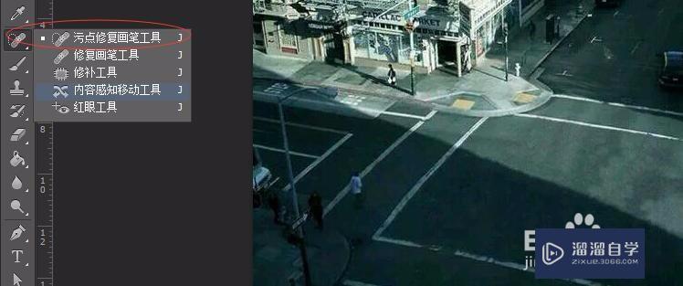 第1步复制一个图层备份,利用“污点修复画笔工具”去掉硬井盖
