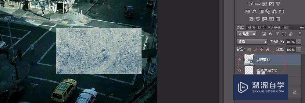 将划痕图片复制进来,放在最上层盖住字,然后在它和字图层之间按住Alt将划痕图片剪贴到字上,就大功告成了
