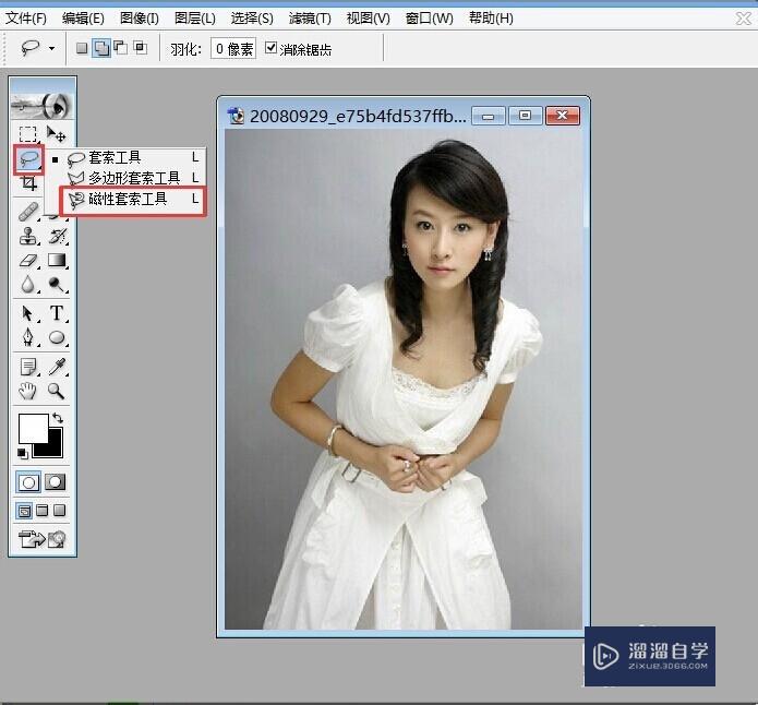 在PS页面空白处双击鼠标左键,选择照片,然后点击【套索工具】下角的三角,选择【磁性套索工具】