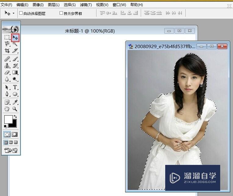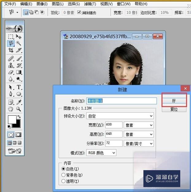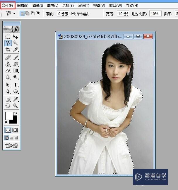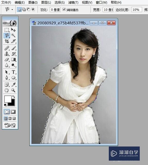 按住鼠标左键,在人物的头顶上方,边缘处开始使用磁性套索工具,因为它有自动吸附的功能。做完效果如图