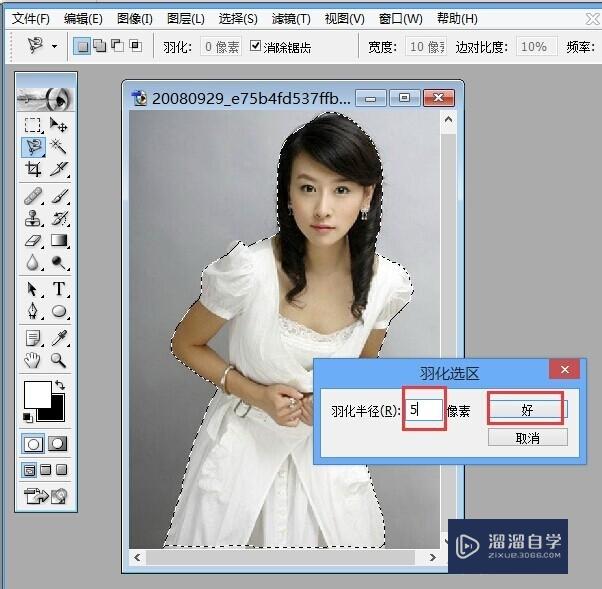 对准图片右击鼠标,弹出选择框,选择点击羽化,在弹出的的框框里,输入数值5,在点击【好】,版本不同,但是现在的版本是确定,所以都是一个意思
