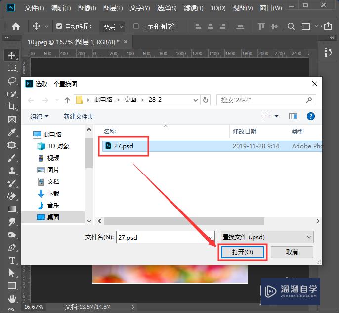 选择我们刚刚保存的27.PSD文件,点击【打开】,如图所示。