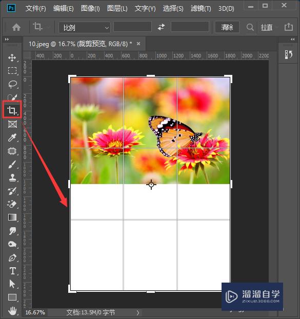 我们点击【裁剪工具】把花丛的图片背景向下拉长一点,如图所示。