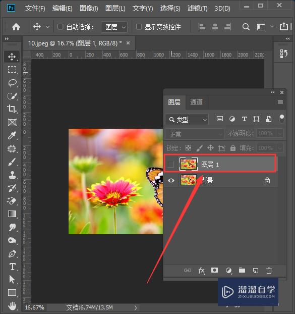 接下来,我们重新打开一张花丛的图片,然后按下【CTRL+J】复制一个图层1出来,把它暂时隐藏起来,如图所示。