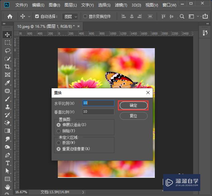 6、点击【滤镜】-【扭曲】-【置换】设置参数,点击【确定】。