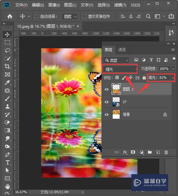 最后,在图层1的下方拖入水波纹的图片。我们选中图层1调整为【强光】,填充为【82%】就完成了