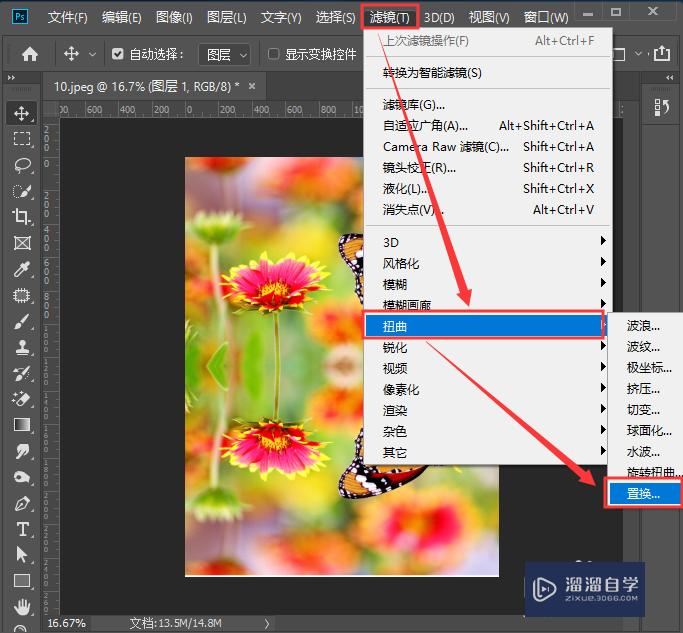 我们选中垂直翻转的图片,在上方点击【滤镜】向下找到【扭曲】选择【置换】设置水平和垂直的参数,点击【确定】。