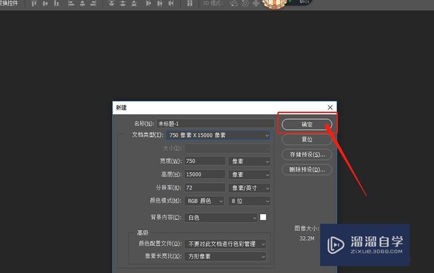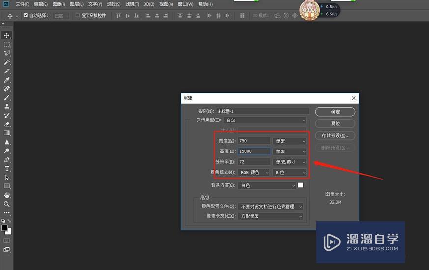在跳出的新建对话框中填写好宽度、高度和分辨率、颜色模式。