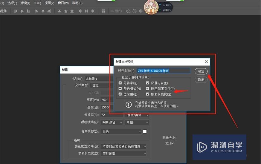 在新建文档预设对话框里可以填写好预设名称,勾选需要预设的项目,然后点击确定。
