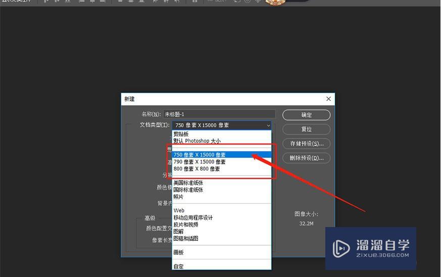 预设好后,每次点击新建时,可以直接在文档类型里选择之前预设好的尺寸。