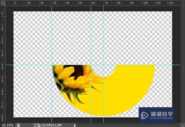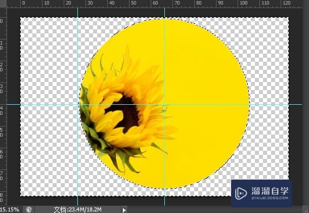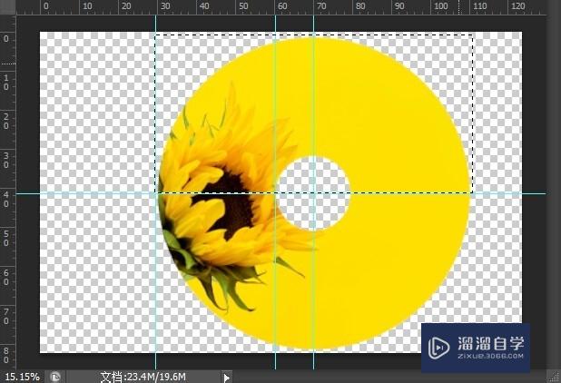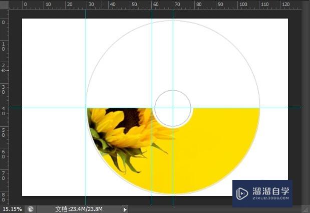 选择【椭圆选框】工具,按【Shift+Alt】键,在辅助线交汇点按下鼠标左键并拖拽绘制出如图所示选区,按【Delete】键,删除选区图像。