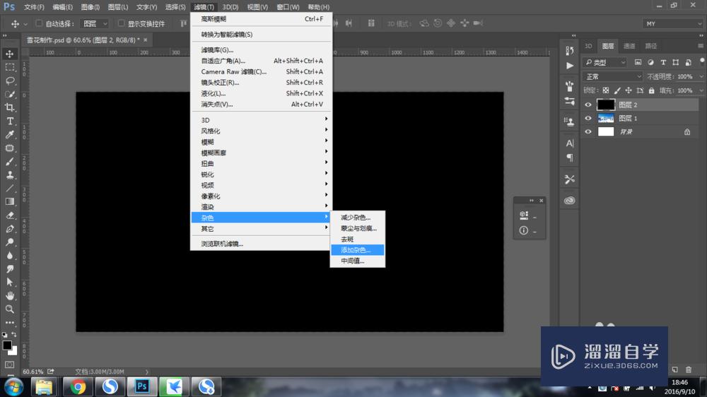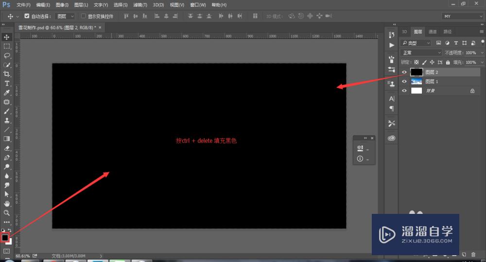 首先打开你要添加下雪效果的图片,然后按 Ctrl+Alt+shift+N 新建图层,再按 Ctrl+delete 填充前景色。(首先你的前景色得和图中一样为黑色)