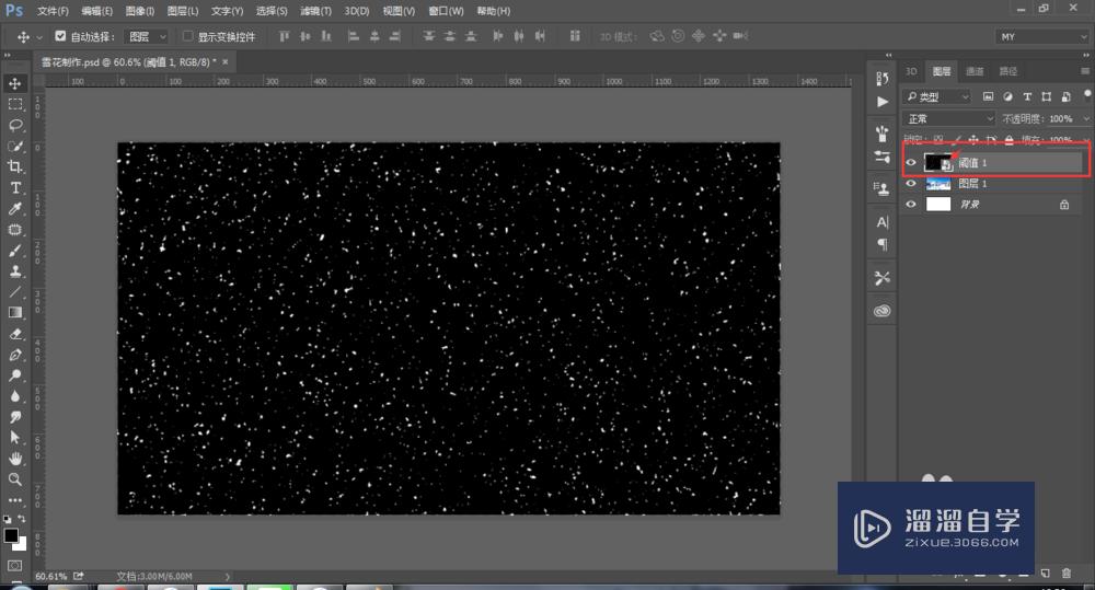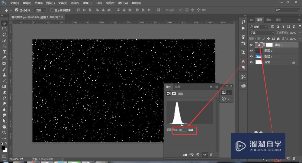如图,点击图层底部的“斜半圆”,选择“阈值”,会多出一层调整层,双击 调整层前面的“斜半圆”修改阈值色阶,这里我们给84。(它是控制雪花数量的)