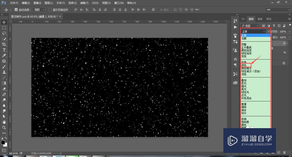 最后一步,点击图层混合模式选项的下拉图标(软件默认“正常”),我们选择“滤色”,雪花效果出来了。
