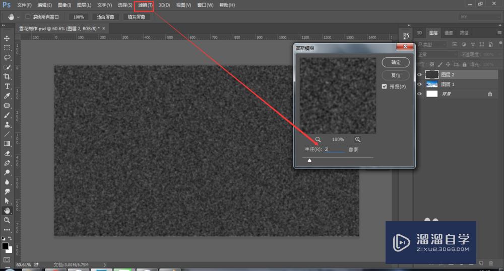 同样,选择“滤镜”→“模糊”→ “高斯模糊”;这里半径设为2,点击“确定”。(这里数值越大,后面的雪花会越大)