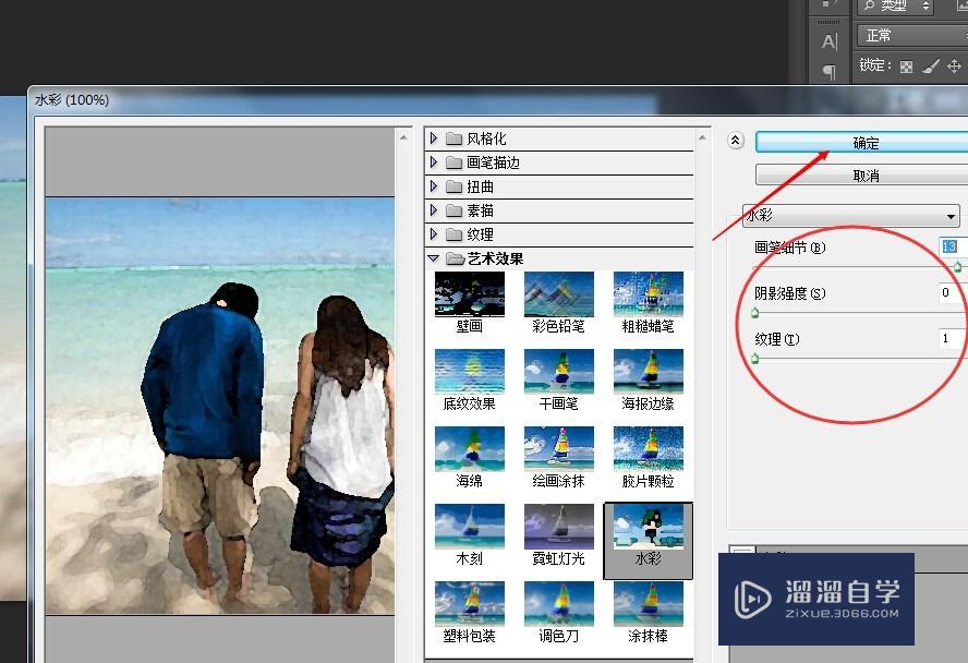 在选项中找到“水彩”点击,可以看到左边预览图产生了变化,变成了水彩效果。